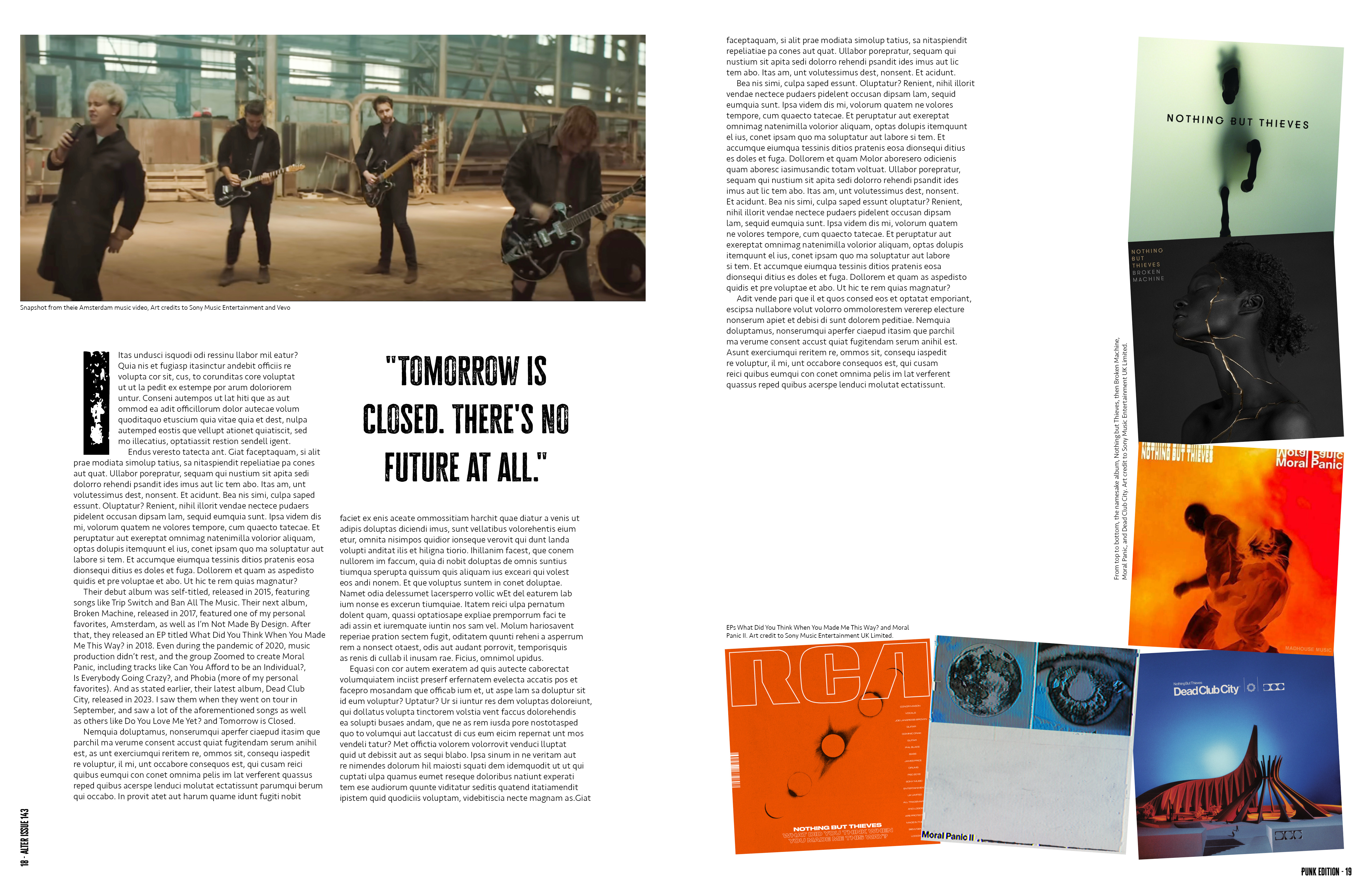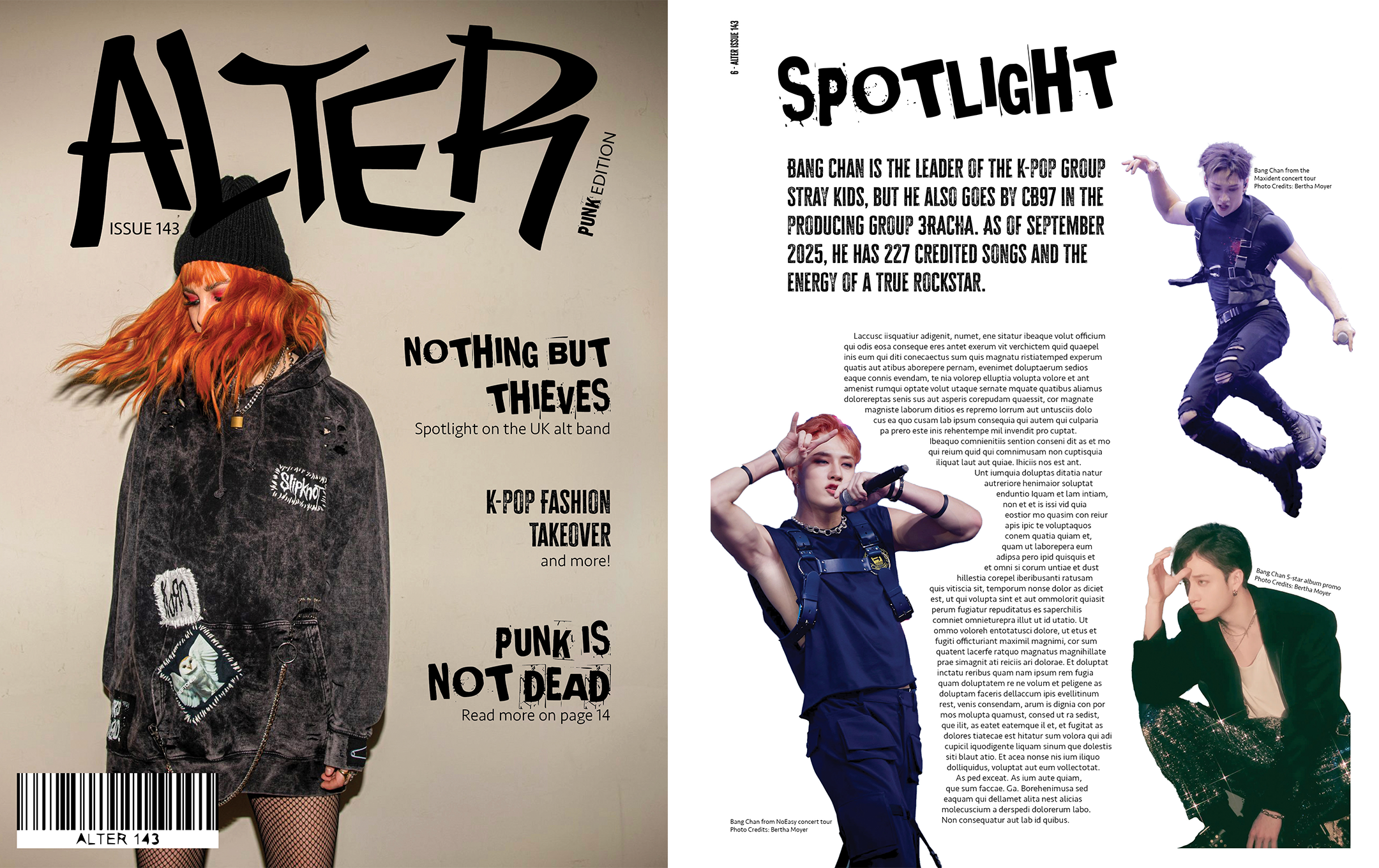 For this project, I created a magazine. I chose the name Alter both to pay homage to the alternative styles that inspired many of the design choices I made, but also because of the definition "to change." I was responsible for all aspects of the publication, including the layout, image curation, any copywriting, and typography. I was really interested in grunge and punk design, so that style informed many of the aesthetic decisions I made with the design.