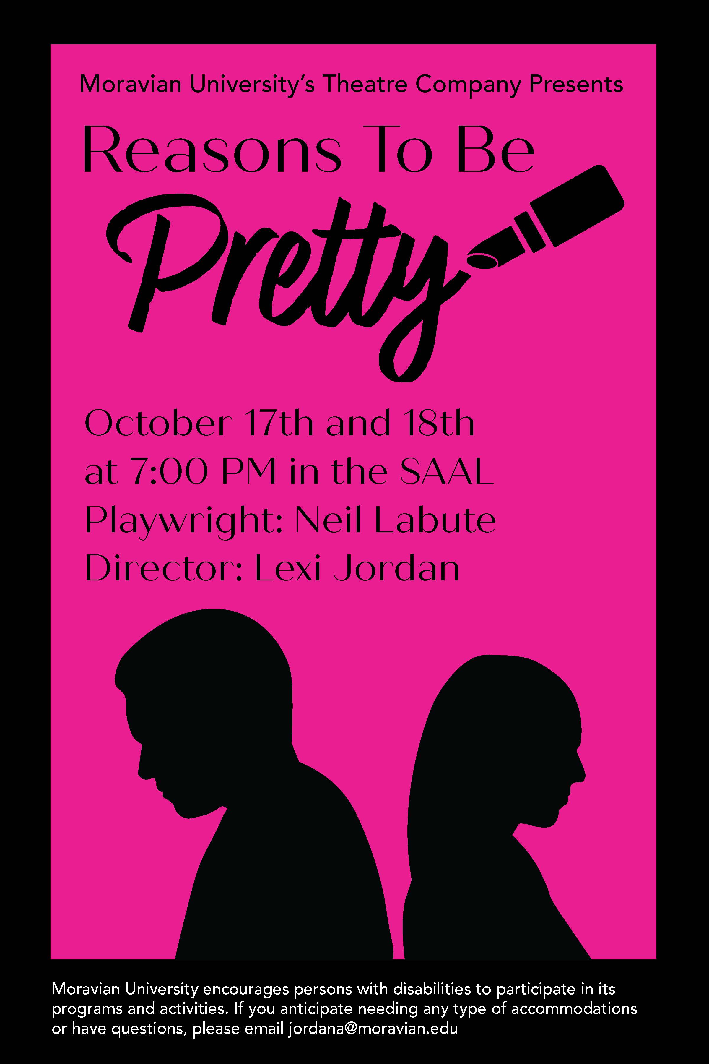 This was my first Studio South client at Moravian. The Moravian Theatre Company comissioned Studio South to design a poster for their student directed play, "Reasons To Be Pretty." I was responsible for all aspects of the design, including the typography and the graphics.